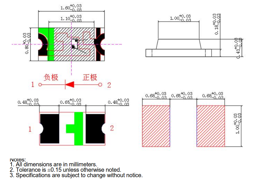 LED SMD 0603 czerwony; jasność: 100-150mcd; prąd diody: 5mA Długość fali: 620-625nm; kąt świecenia: 120°; napięcie: 1,8-2,2V