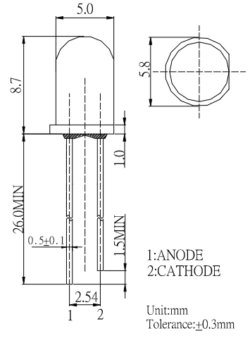 LED; THT; 5mm; czerwony; 500~1000mcd; 660nm; 30mA; 30°; 1,85~2,5V; -40~+85°C; wodnoprzeźroczysta