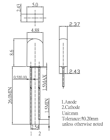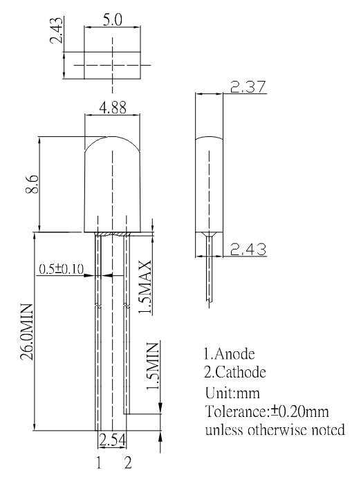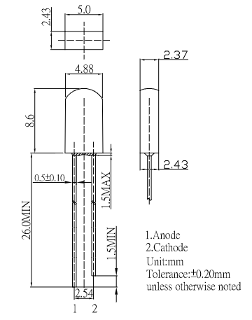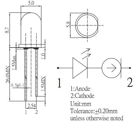 LED THT; dyfuzyjny; czerwony; jasność: 200-1000mcd; kąt świecenia: 35°; prąd diody: 20mA Długość fali: 620-630nm; moc: 50mW; napięcie pracy: 1,8-2,4V