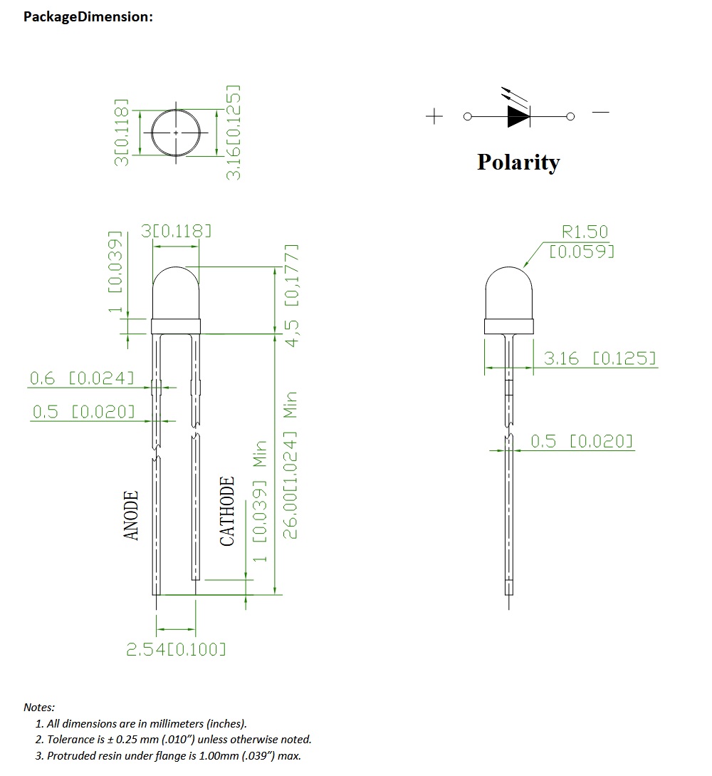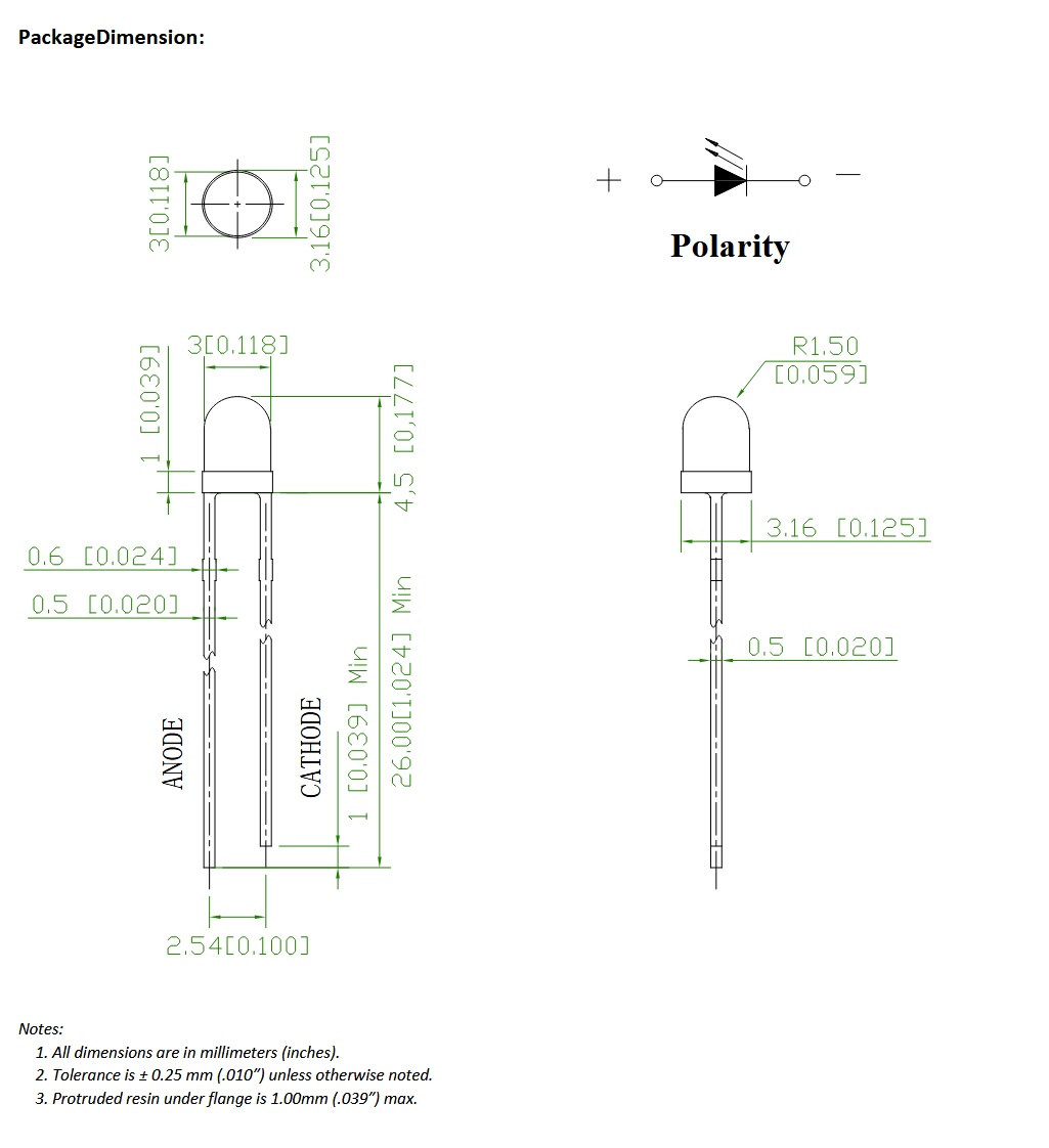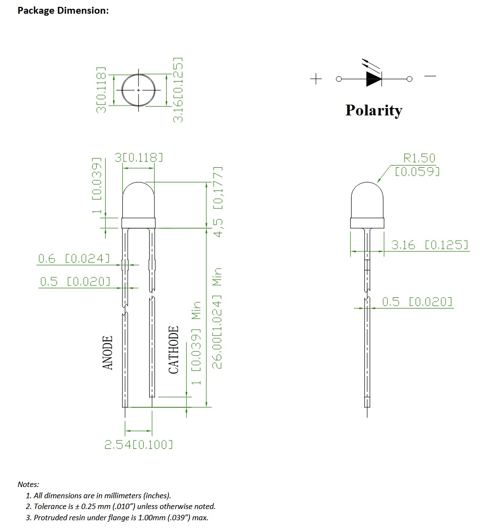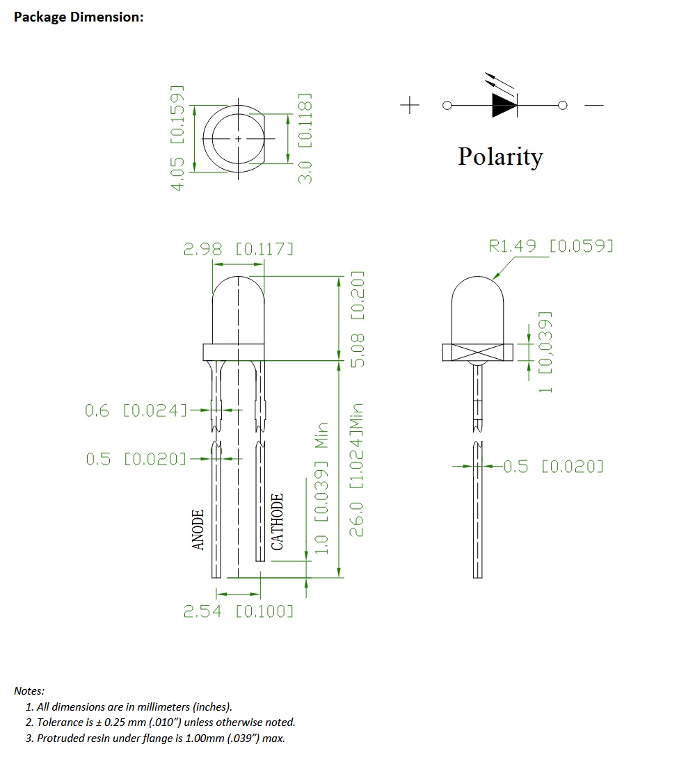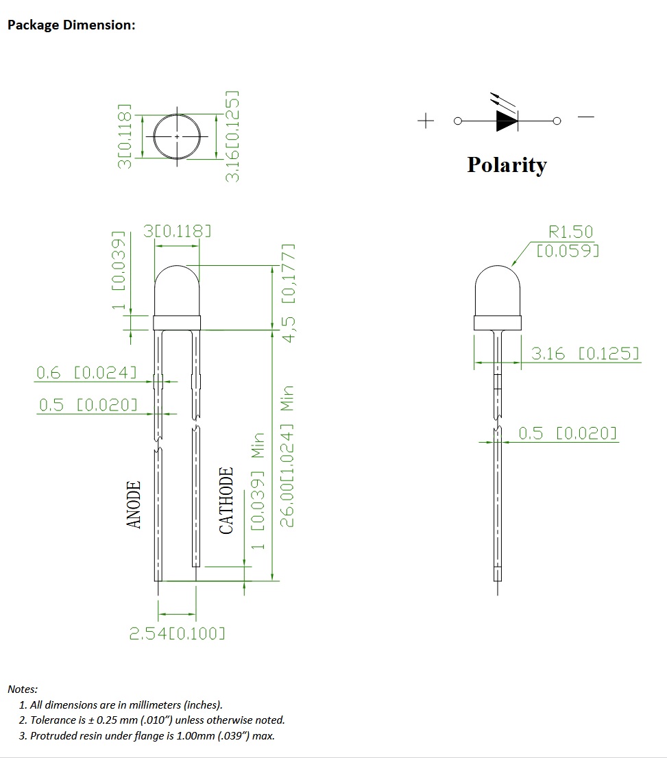 Montaż: THT; Kolor: zielony intensywny matowy; Jasność: 5000mcd; Kąt świecenia: 60°; Prąd diody LED: 20mA