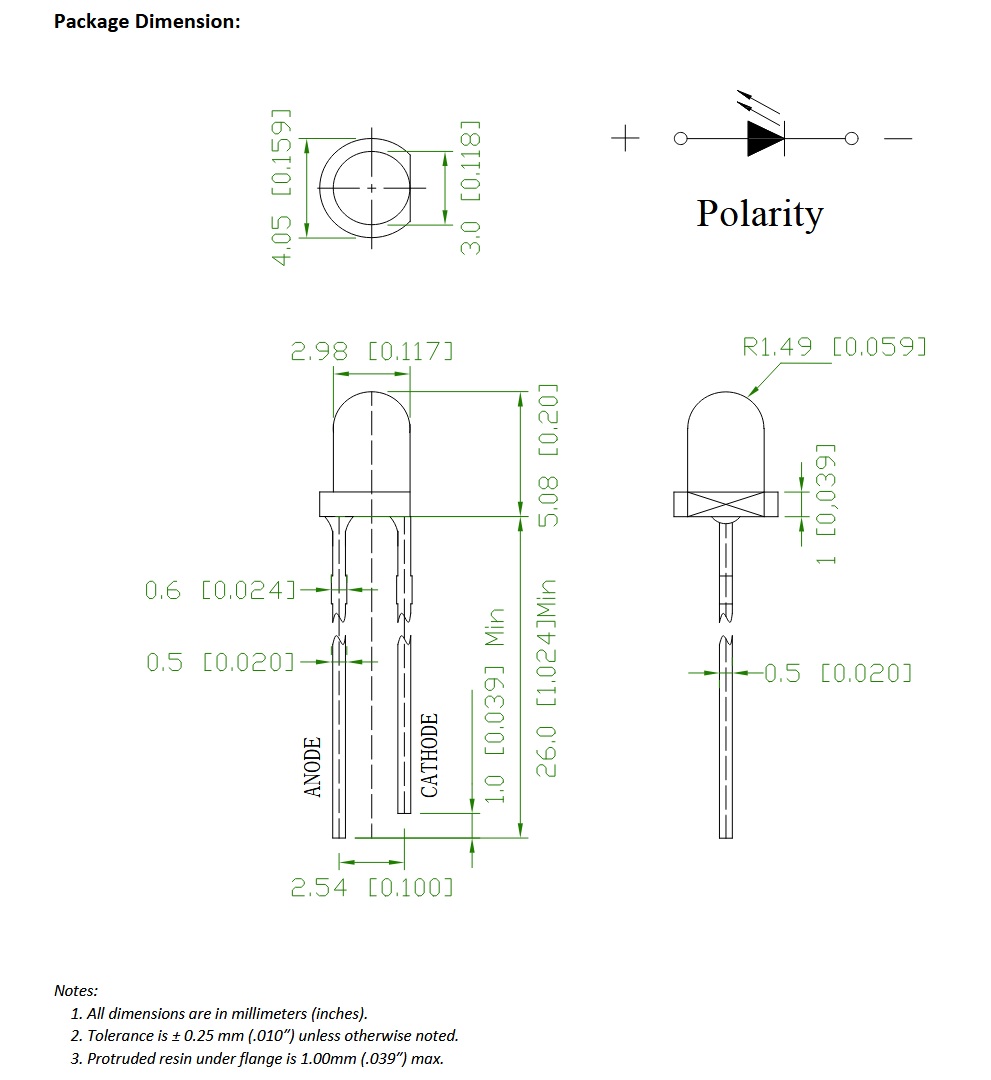 LED THT; 3mm; zielony; jasność: 80-150mcd; kąt świecenia: 45°; prąd diody: 30mA Długość fali: 574nm; dyfuzyjna; moc: 75mW; napięcie pracy: 2,2-2,5V