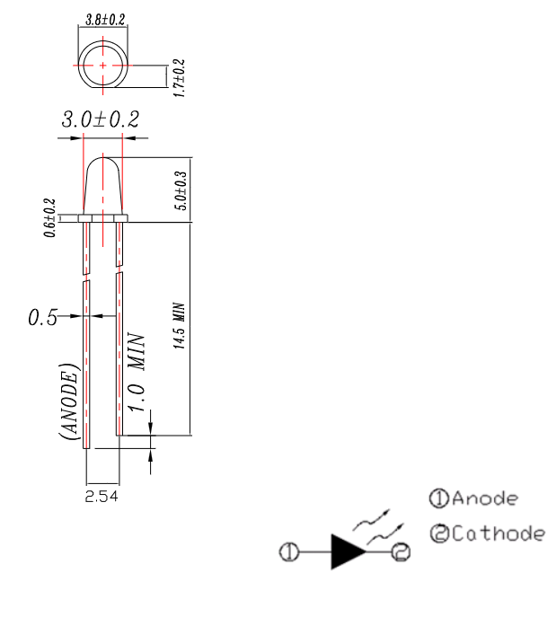 LED THT; dyfuzyjny; czerwony; jasność: 250mcd ~ 420mcd; kąt świecenia: 30°; prąd diody: 25mA Długość fali: 624nm ~ 632nm; moc: 60mW; napięcie pracy: 1,7V ~ 2,4V