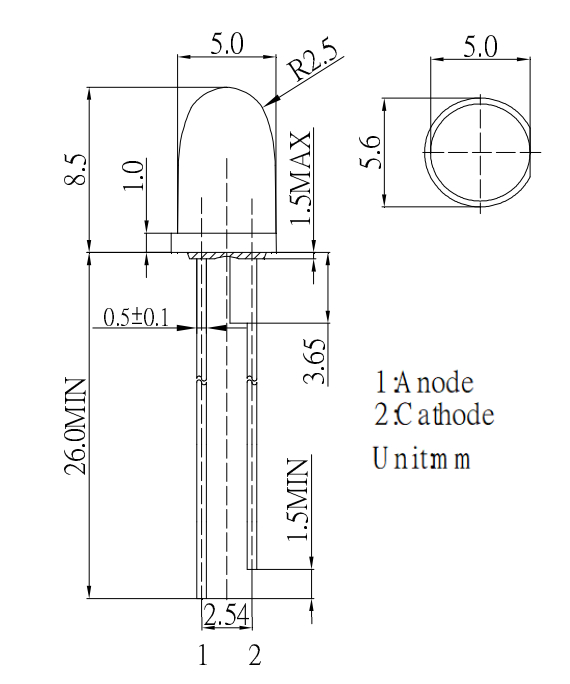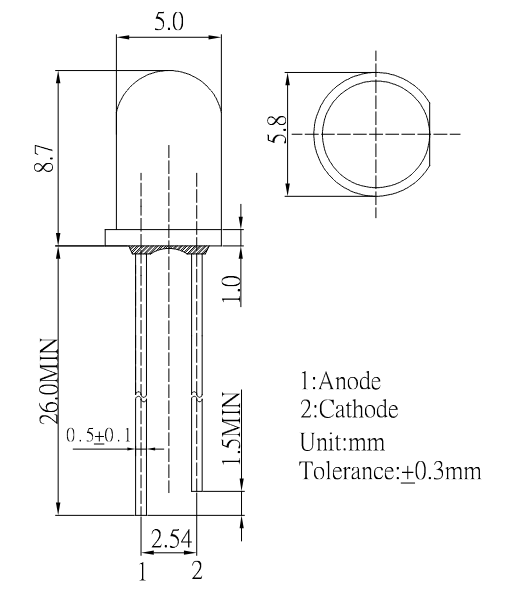 | Czerwony | 620~630nm | 1560~2180mcd | 50mA | 140° | 1,8~2,6V | -30°C ~ 85°C | THT | 5mm | |||||||||||||||||