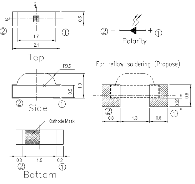 LED SMD 0805 czerwony; wymiary: 2x1,25x0,8mm; jasność: 150mcd; prąd diody: 30mA Długość fali: 620-630nm; kąt świecenia: 120° napięcie: 2-2,6V