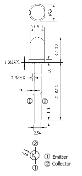 Fototranzystor N0P08L59; 5mm; długość fali: 950nm; napięcie kolektor-emiter: 60V Kąt widzenia: 38°; moc: 100mW; temperatury pracy: -40°C~85°C