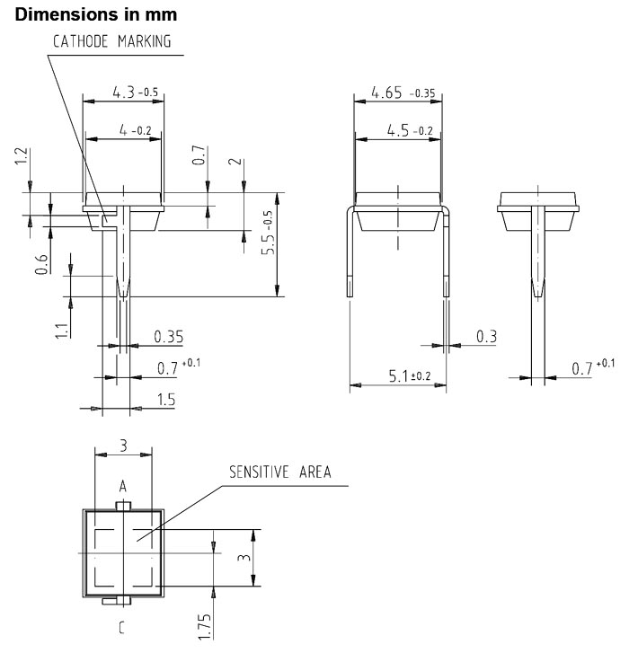 BP104S-Z / BP 104 S-Z Fotodioda BP104S-Z; 4.5×4×1.2mm; Vr=20V; Id=2nA; IL=55uA; 150mW; temperatura pracy -40÷100°C; długość fali 850nm; kąt świecenia 60°