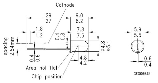 5,1mm 1,3V 20° THT 80mA -40°C ~ 100°C 900nm 750nm~1100nm