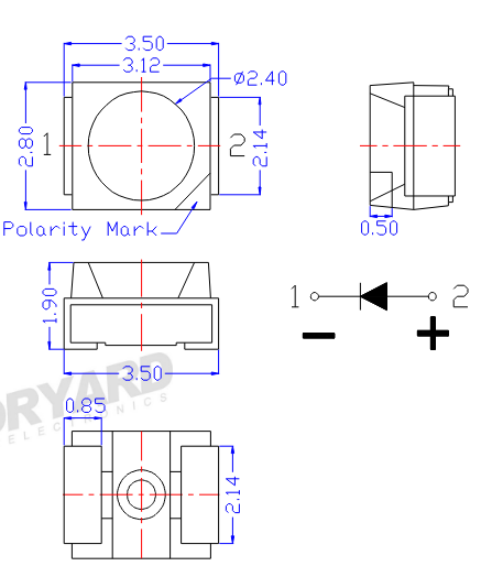 LED SMD; 3528 (PLCC2); czerwony; jasność: 500-980mcd; kąt świecenia: 120°; prąd diody: 50mA Długość fali: 620-630nm; przezroczysta; moc: 120mW; napięcie pracy: 1,8-2,4V