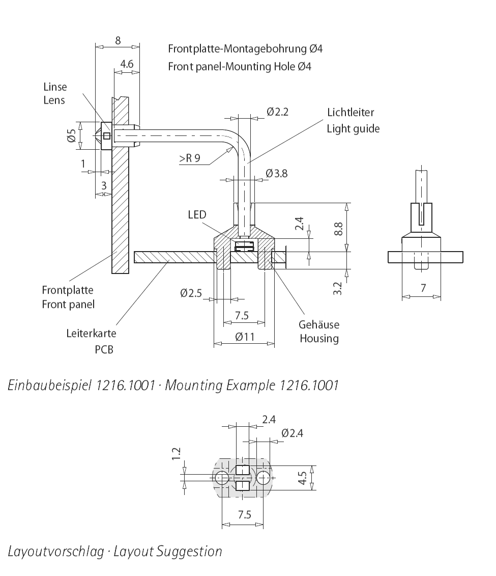 Światłowód do LED okrągły Długość : 7mm, oprawka: z mocowaniem do PCB