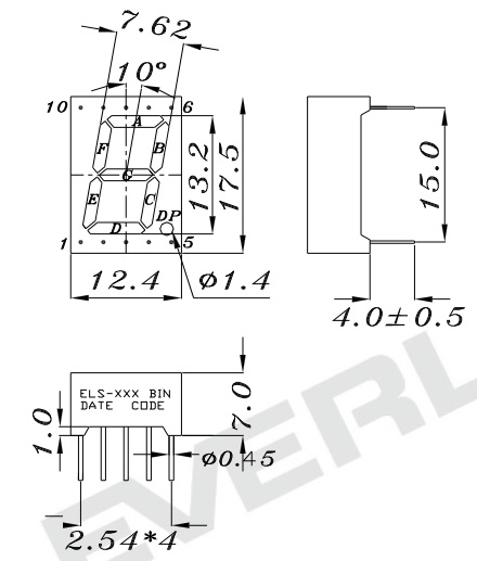 Wyświetlacz LED 1-cyfrowy THT; Kolor podświetlenia: czerwony; Producent: Everlight; jasność: 4-8,9mcd wspólna anoda; raster wyprowadzeń: 2,54mm; Prąd przewodzenia: 25mA