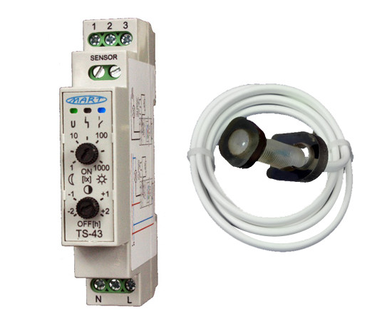 AUTOMAT ZMIERZCHOWY TS-43-2 przeznaczony jest do samoczynnego załączenia odbiornika (np. reklamy, witryny) z chwilą zapadnięcia zmierzchu i wyłączenia w astronomicznym środku nocy (środek między zachodem a wschodem słońca). Moment wyłączenia można regulować ±2h od środka nocy.