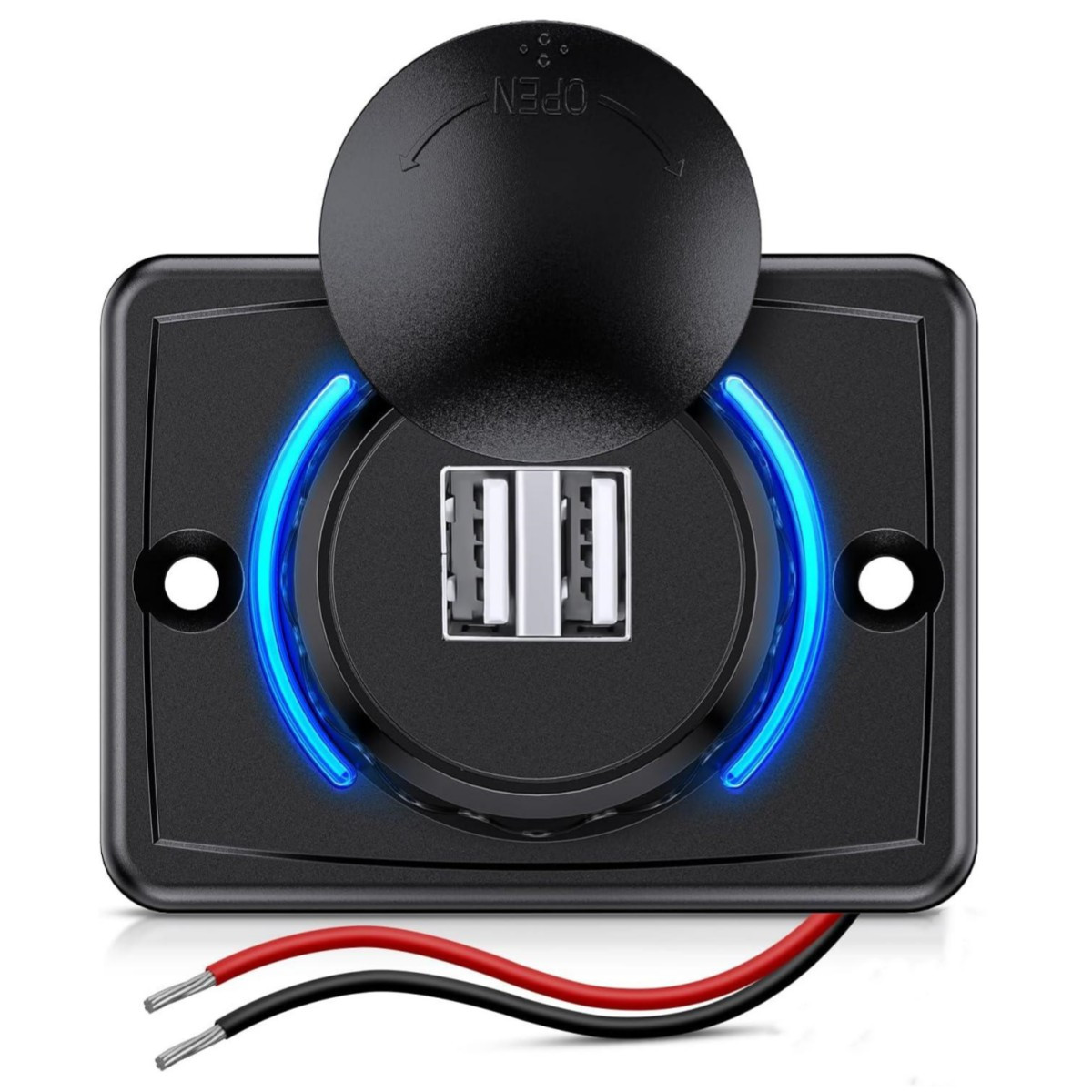 Kształt: prostokątny; Kolor korpusu: czarny; Napięcie przewodzenia: 12-24V; Podświetlenie: niebieski; 2 porty USB