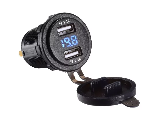Podwójna ładowarka samochodowa USB z cyfrowym voltomierzem, okrągła, niebieska Napięcie: 12-24V, 2x 2.1A, kształt:okrągły, kolor: niebieski
