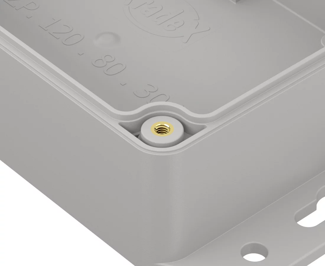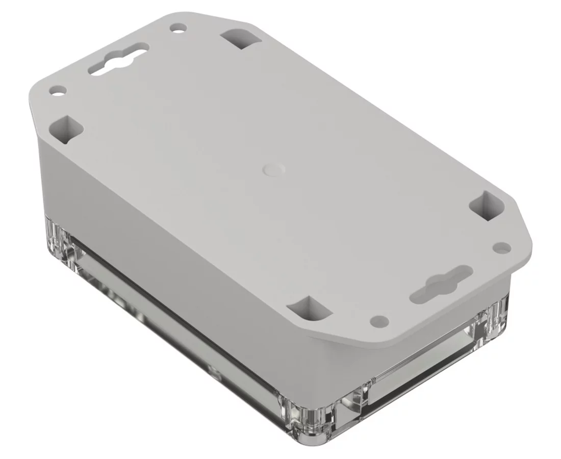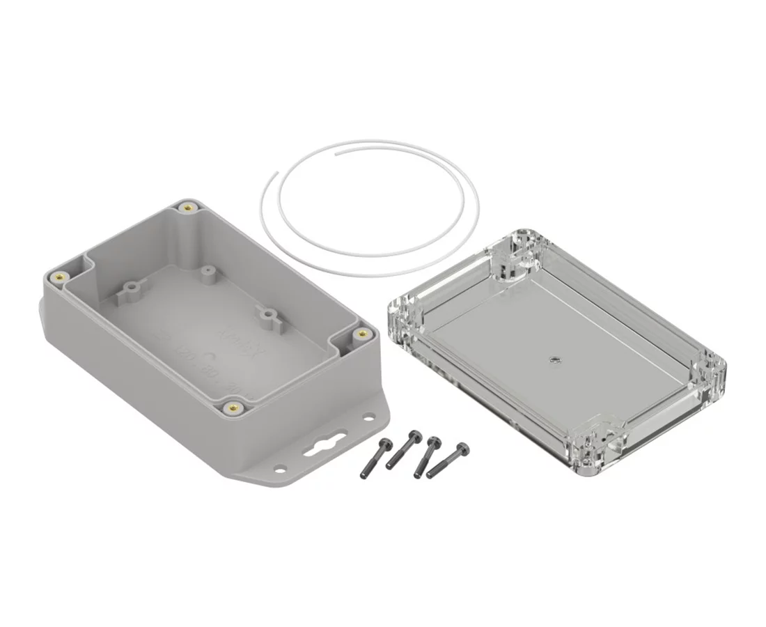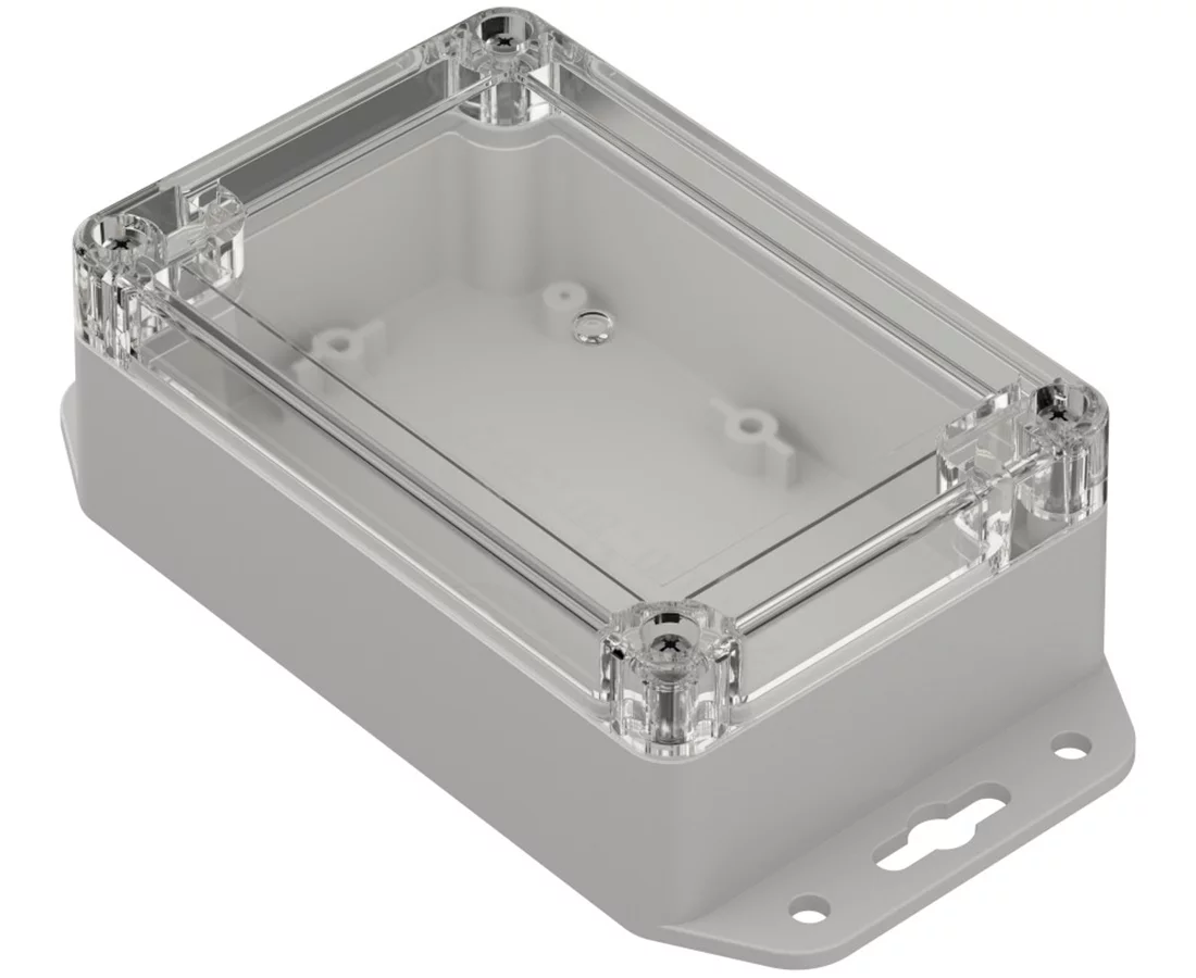 Obudowa hermetyczna ZP120.80.45 jasnoszara Wymiary: 45.2x81.6x121.4mm, przeźroczyste wieczko, z tulejkami mosiężnymi