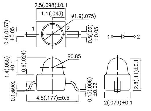 LED miniaturowy; zielony (568nm) Φ1.9mm; w obudowie z wyprowadzeniami wymiary: 2.5x2.0x2.8mm;jasność: 80mcd;kąt świecenia 20°;IF=20mA, VF=2.2V