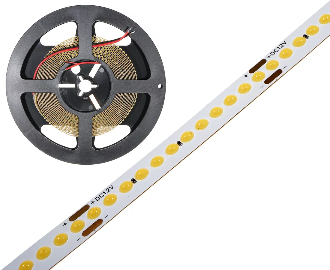 n. biała(4000k), 1200 LED DOT COB, IP33, 12V, 9w/m, 22lm/w, 180°, CRI:>90 Ra, rolka: 8mm x 5m, szerokość PCB: 8mm, temp. pracy: -20°C ~ +45°C, białe tło