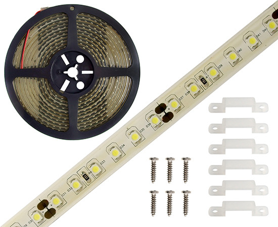 Taśma LED zimna biała (6300K), 600LED 3528, 1.58A, 38W, 24V, 120°, 2400lm rolka: 10mm x 5m, szerokość PCB: 8mm, temp. pracy: -20°C~+60°C, białe tło, IP68