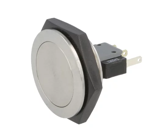30mm; monostabilny; ON-(ON); SPDT; stal nierdzewna; silber; do lutowania; płaski przycisk; 3A; 250VAC; IP67; IK07; żywotność: 1.500.000 cykli