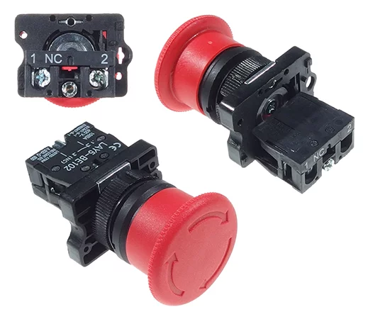 Przycisk; czerwony grzybkowy; średnica: 40mm; powrót przez obrót; N/C; jeden przycisk; prąd: 10A; wymiary: 79,5x29mm