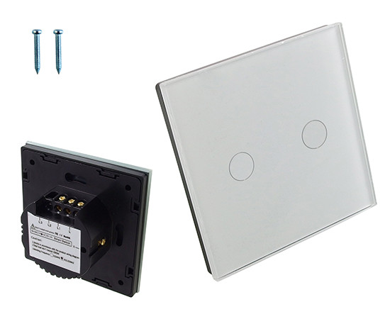 Przełącznik dotykowy, dwukanałowy łączy w sobie estetyczny i nowoczesny wygląd z funkcjonalnością i bezpieczeństwem. Przedni panel przełącznika wykonany jest ze szkła, które zapewnia interesujący design i zabezpiecza użytkownika przed przypadkowym porażeniem. Sam przełącznik dzięki takiemu rozwiązaniu jest ognioodporny, odporny na zachlapania i zarysowania. W centralnym punkcie przełącznika umieszczono diodę podświetlającą, która zmienia kolor po naciśnięciu przycisku.Przełącznik posiada wdudowany układ radiowy dzięki czemu może on być sterowany zdalnie na częstotliwości 433MHz.