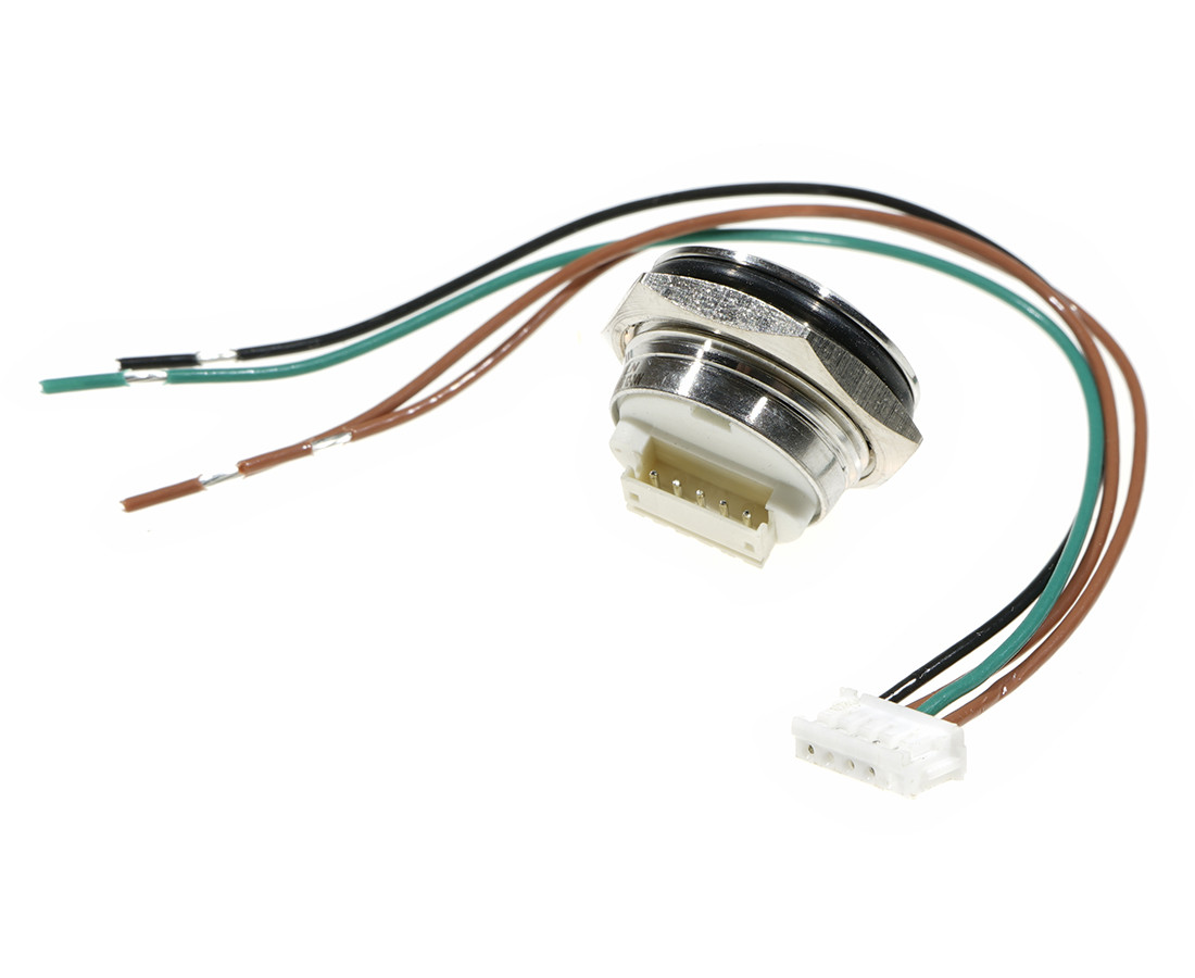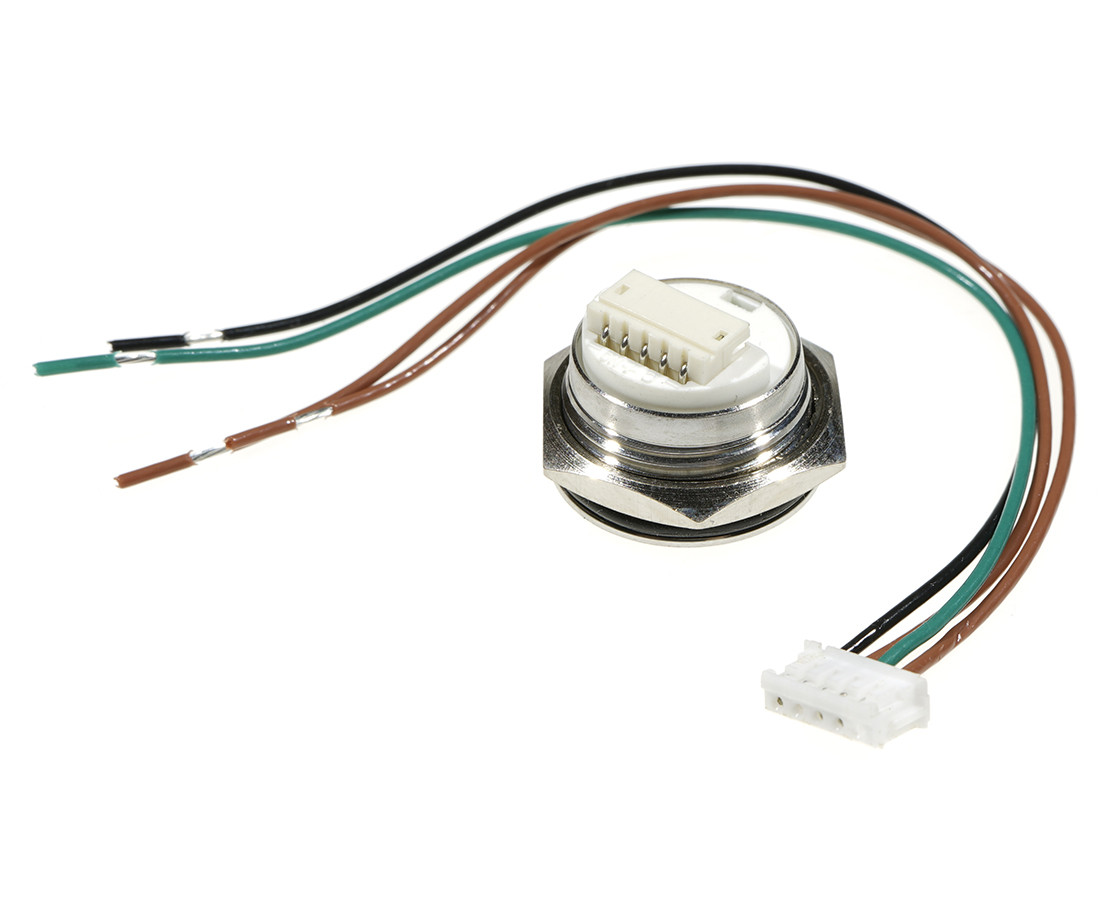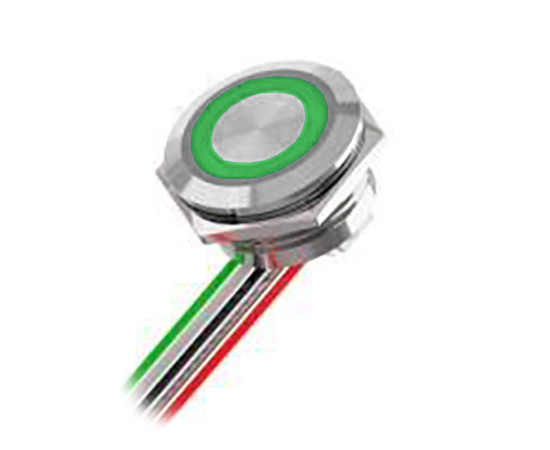 16mm; monostabilny; 1NO; stal nierdzewna; z przewodami kątowymi; z płaskim przyciskiem; krótki gwint; podświetlenie LED 24V; krawędziowe; zielone; 0.05A; IP67; żywotność: 100.000 cykli