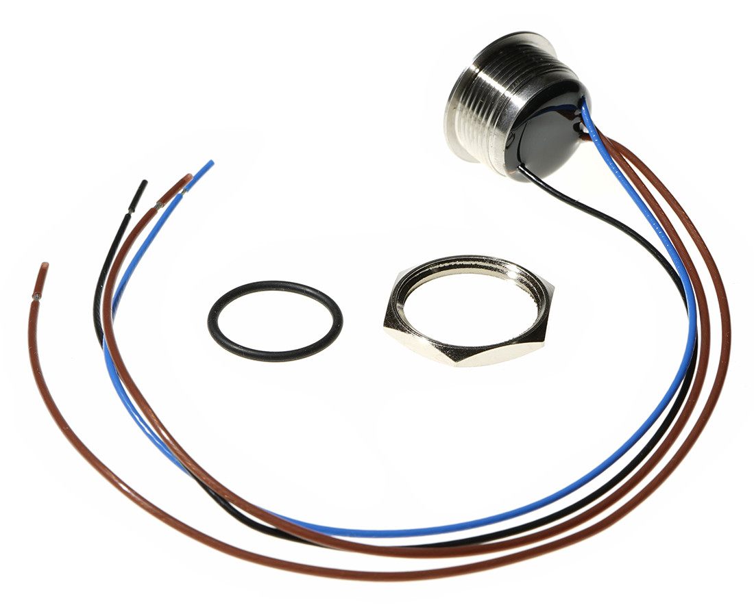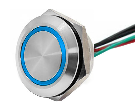 19mm; monostabilny; 1NO; stal nierdzewna; z przewodami; z płaskim przyciskiem; krótki gwint; podświetlenie LED 12V; krawędziowe; niebieskie; 0.05A; IP67; żywotność: 100.000 cykli