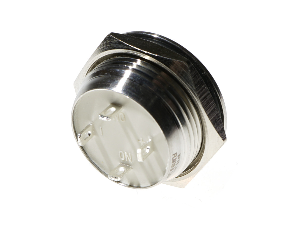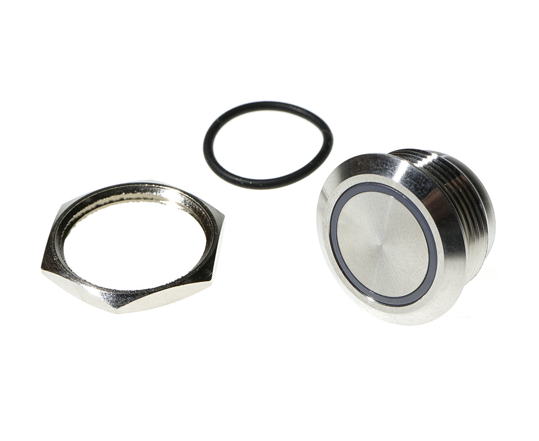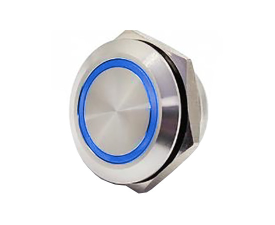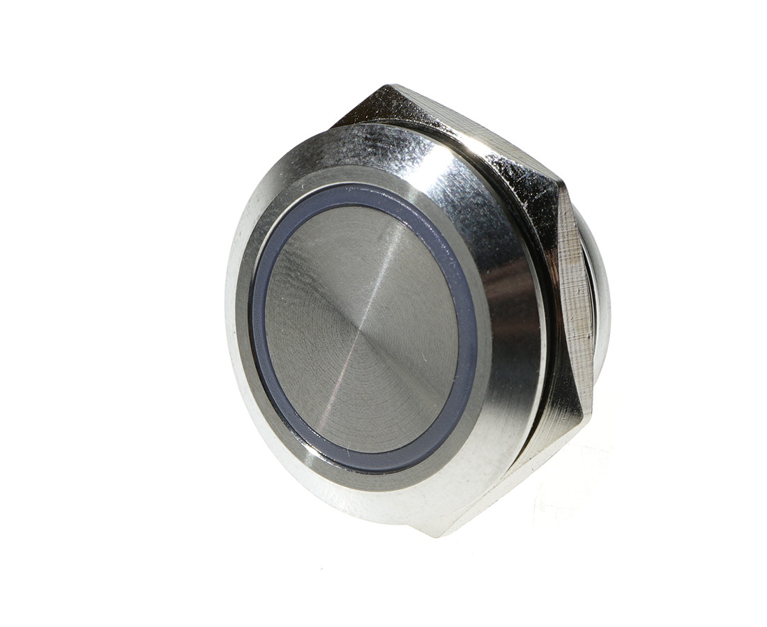 19mm; monostabilny; 1NO; stal nierdzewna; z płaskim przyciskiem; krótki gwint; podświetlenie LED 24V; krawędziowe; niebieskie; 0.05A; IP67; żywotność: 100.000 cykli