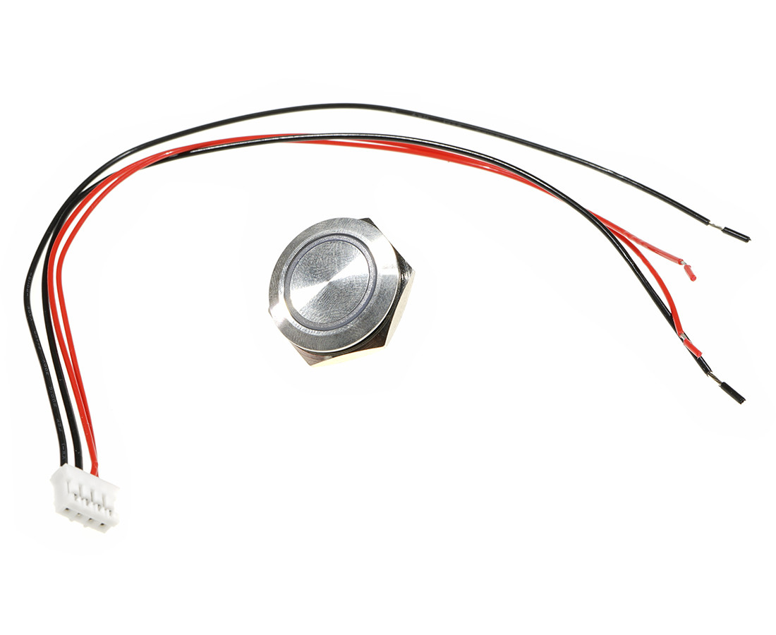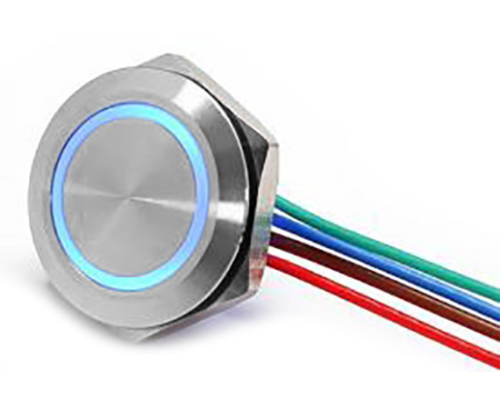 19mm; monostabilny; 1NO; stal nierdzewna; z przewodami kątowymi; z płaskim przyciskiem; krótki gwint; podświetlenie LED 24V; krawędziowe; niebieskie; 0.05A; IP67; żywotność: 100.000 cykli