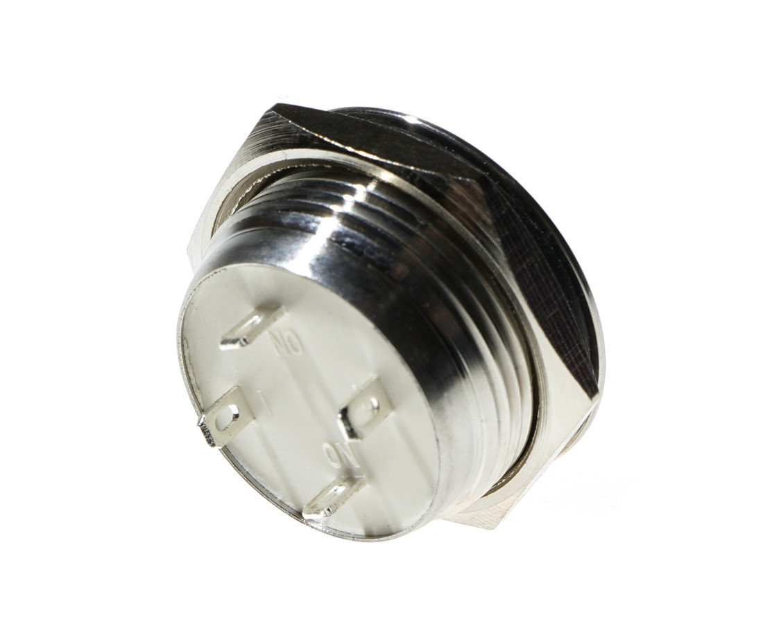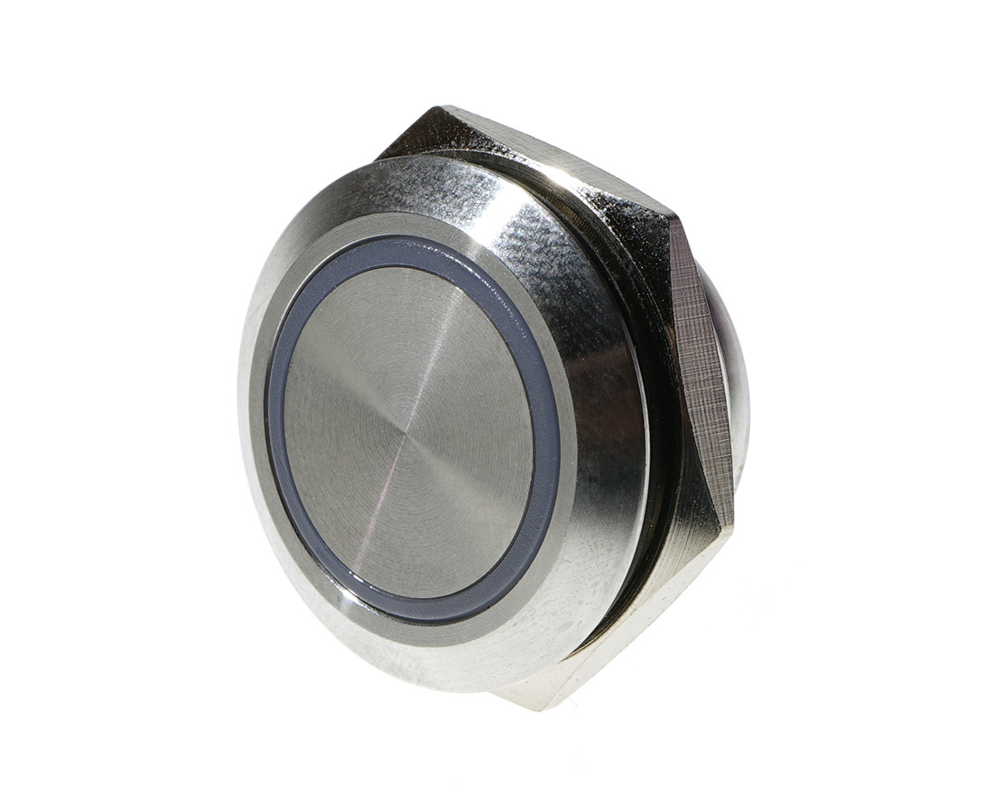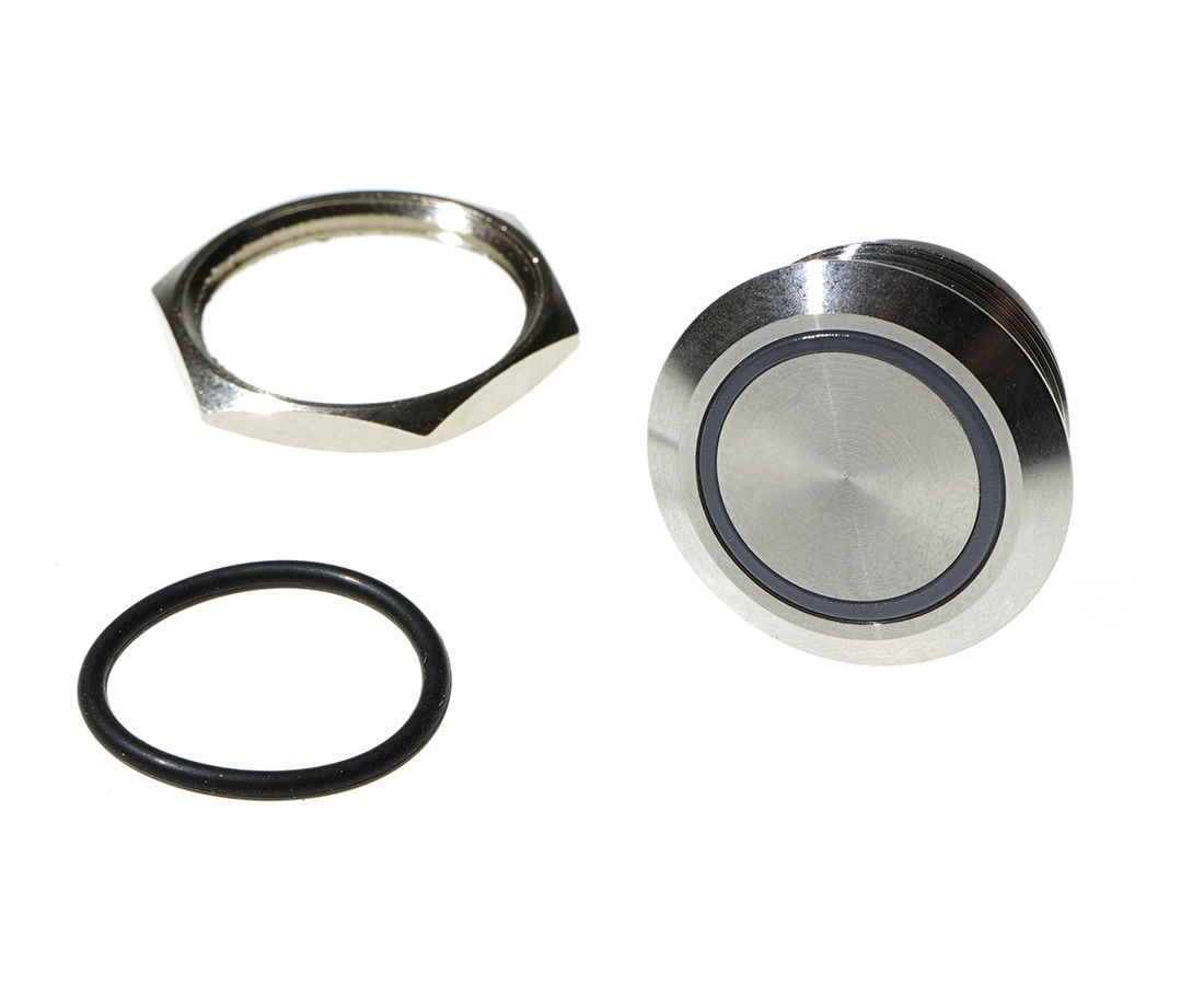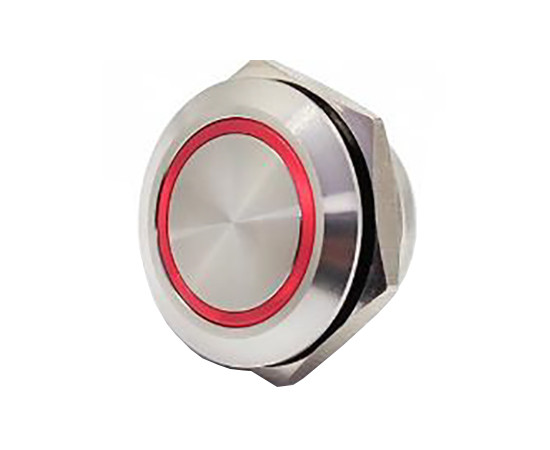 19mm; monostabilny; 1NO; stal nierdzewna; z płaskim przyciskiem; krótki gwint; podświetlenie LED 24V; krawędziowe; czerwone; 0.05A; IP67; żywotność: 100.000 cykli