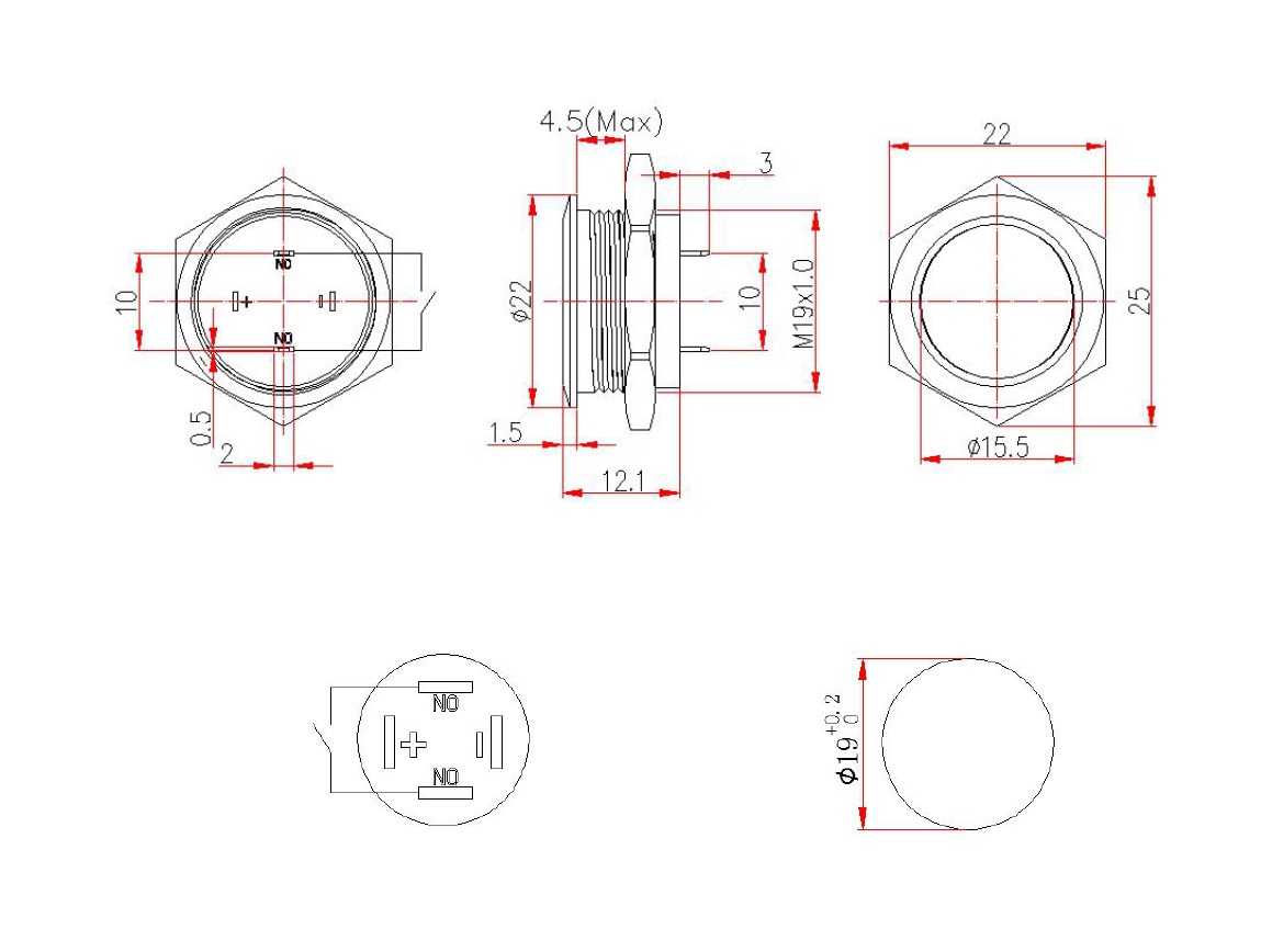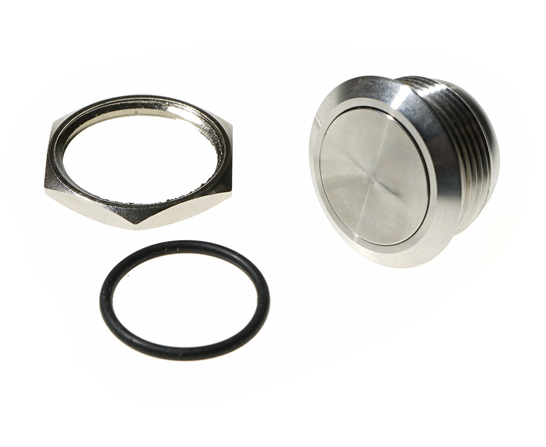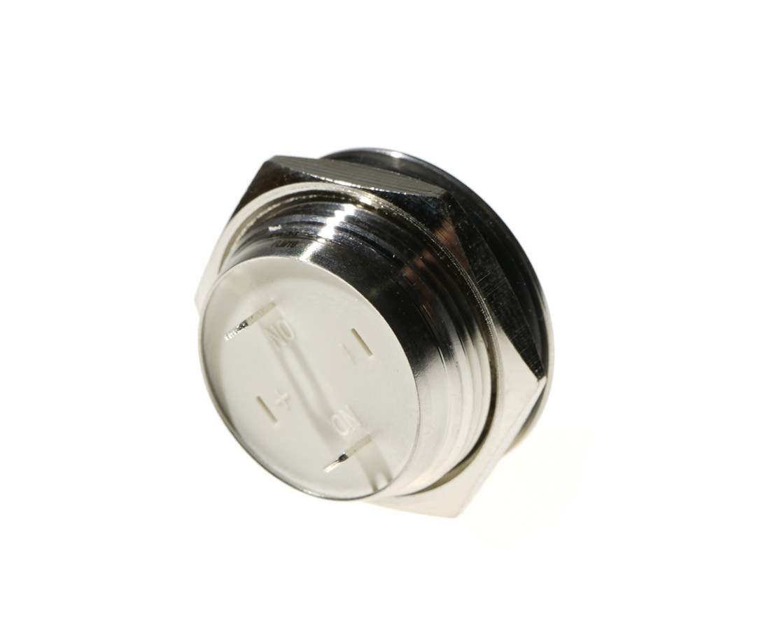 19mm; monostabilny; 1NO; stal nierdzewna; do lutowania; z płaskim przyciskiem; krótki gwint; 0.05A; 12VDC; IP67; żywotność: 100.000 cykli