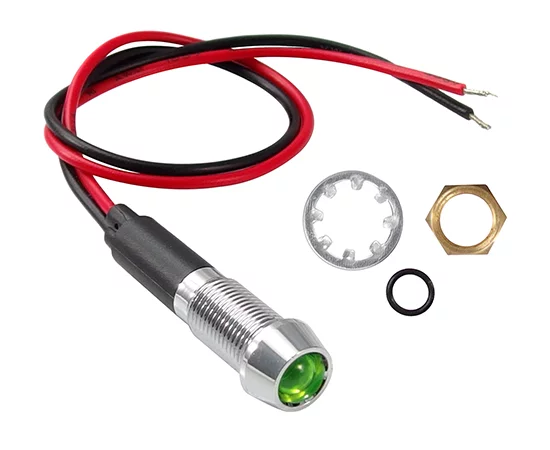 8mm; wklęsła; chromowana; przewody 20cm; podświetlenie LED 24V; zielone; IP65; 20mA; żywotność: 80,000 godzin
