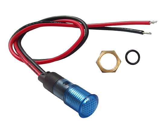 8mm; wypukła; tworzywo sztuczne; przewody 20cm; podświetlenie LED 12V; niebieskie; IP50; 15mA; żywotność: 80,000 godzin