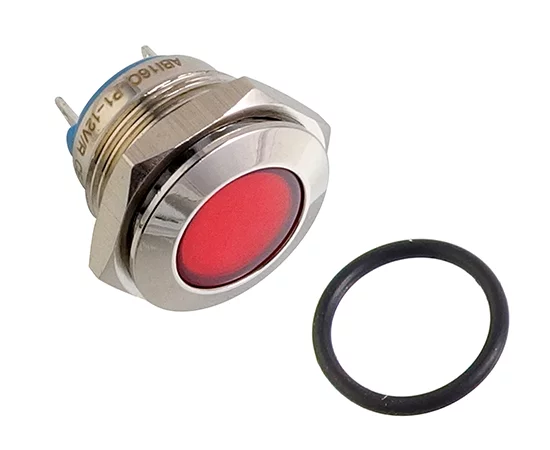 16mm; płaska; chromowana; do lutowania; led matowy czerwony; IP68; IK10; 15mA; 220V; żywotność: 40.000 godzin