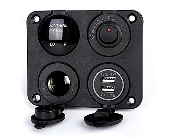 Zestaw 4w1: gniazdo zapal; ładow. USB: 1A, 2.1A; woltom. cyfrowy; ON/OFF Napięcie: 12-24V, napięcie pomiarowe: 6-38V, kształt:kwadrat, kolor: zielony