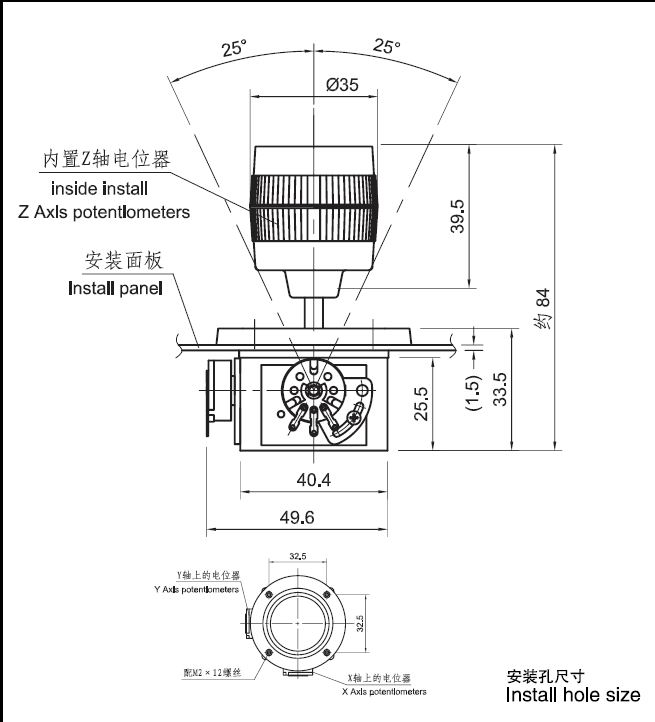Joystick potencjometryczny; 10kR; 50°; 3-osiowy; 1-pozycyjny; na panel wymiary: 40,4x25,5mm