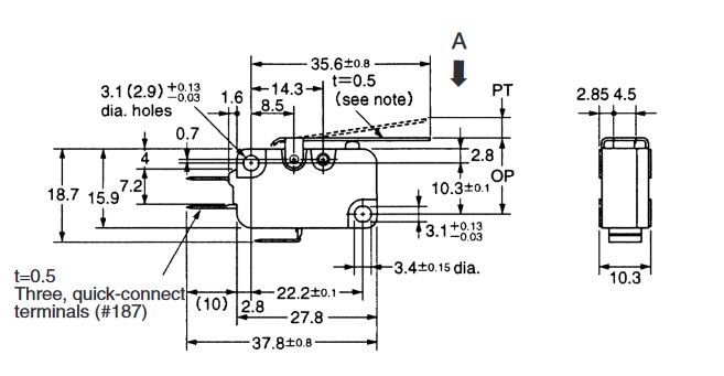 SPDT | ON-(ON) | 5A 125VAC | OMRON | Krańcowy | -25°C ~ 80°C | Konektory 2,8x0,5mm | 19.8x6.4x10.2mm | 1,47N | ||||||||||||||