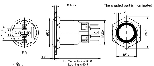 8mm; monostabilny; 1NO; miedziany; do lutowania; z wypukłym przyciskiem; 3A; 250VAC; IP65; IK08; żywotność: 50.000 cykli; temperatura pracy: -20~55°C