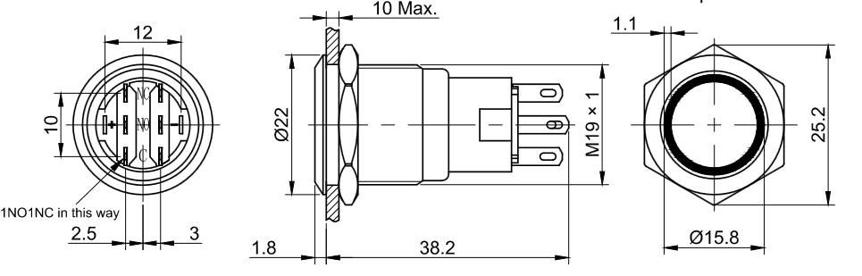 12mm; bistabilny; 1NO1NC; miedziany; do lutowania; z płaskim przyciskiem; 1A; 250VAC; IP65; IK08; żywotność: 50.000 cykli; temperatura pracy: -25~55°C