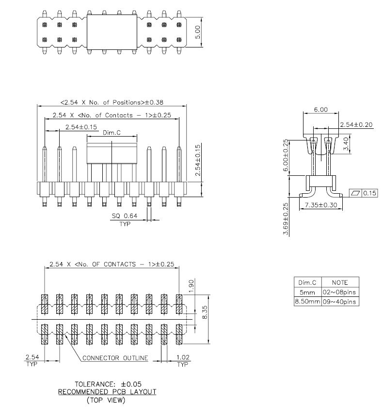 męska; jednorzędowa; 1x40pin, prosta, r.2,54mm, SMD, styki pozłacane; szerokość z padami 8.5mm (C=3.0mm)