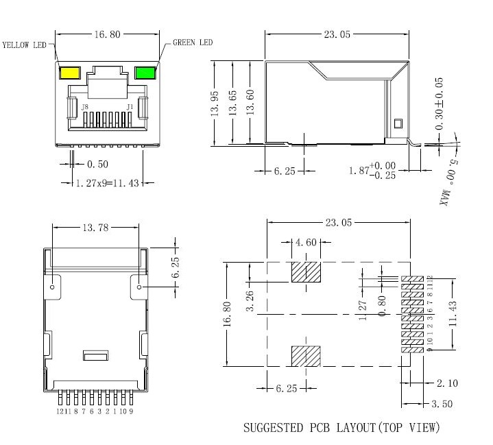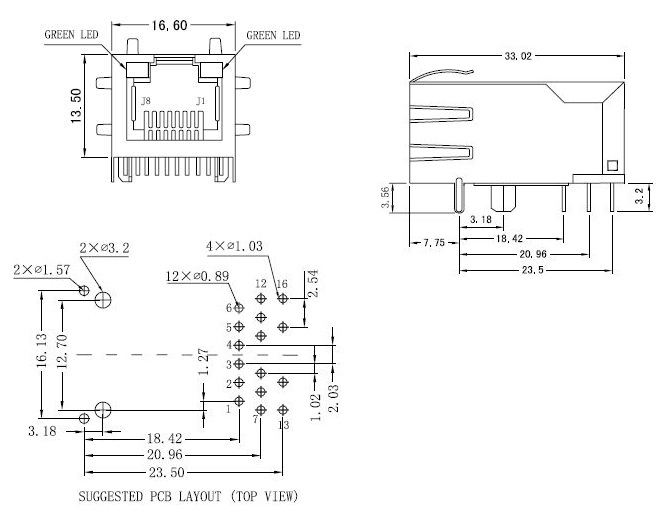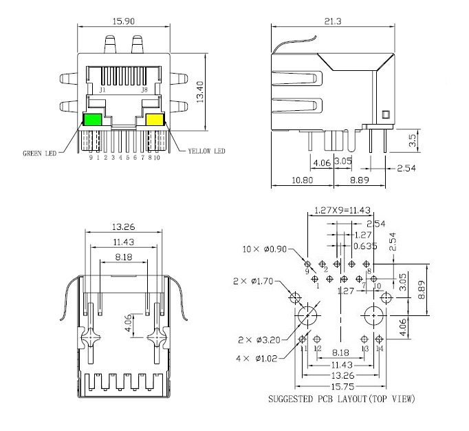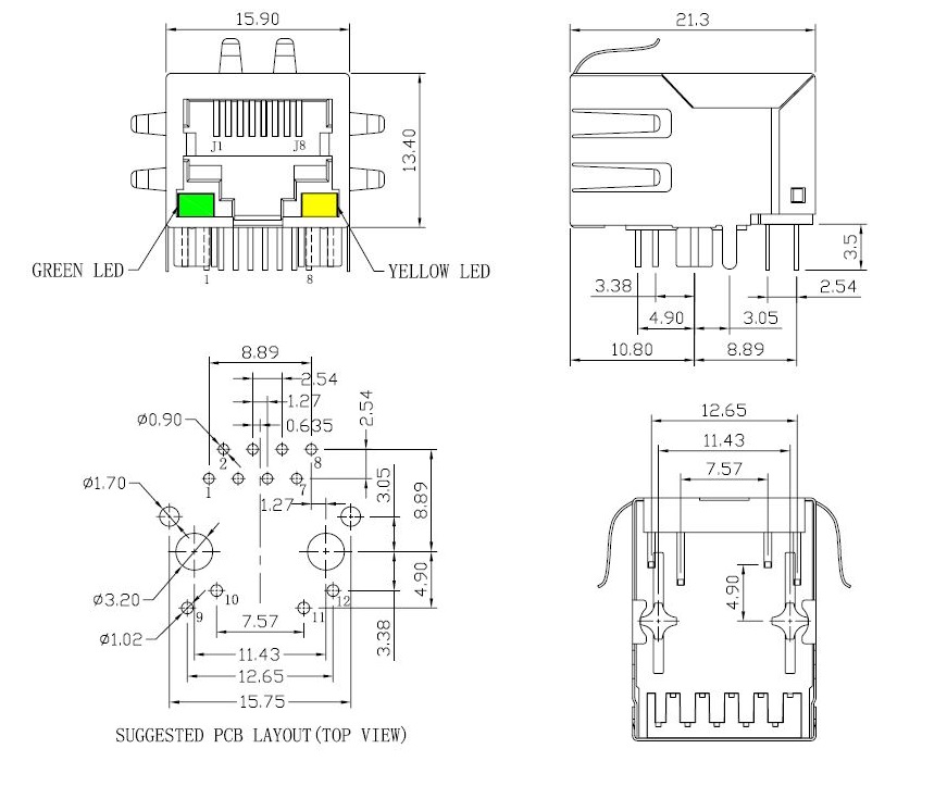 Link-PP | Z LED | 10/100 Base-T | THT | Pozioma | 8p8c | Ethernet(NoN PoE) | Dolny | ||||||||||||