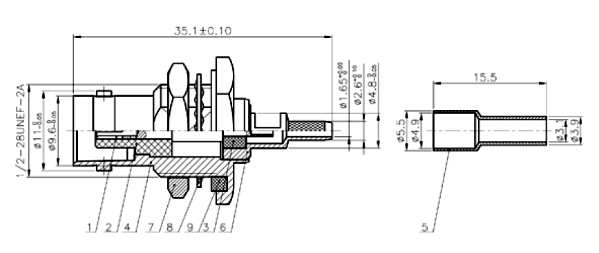 gniazdo żeńskie SMA na panel, zaciskane RG174, skręcane, 50 Ohm izolator z teflonu, korpus i nakrętka mosiężne, pin fosforobrąz, złocone